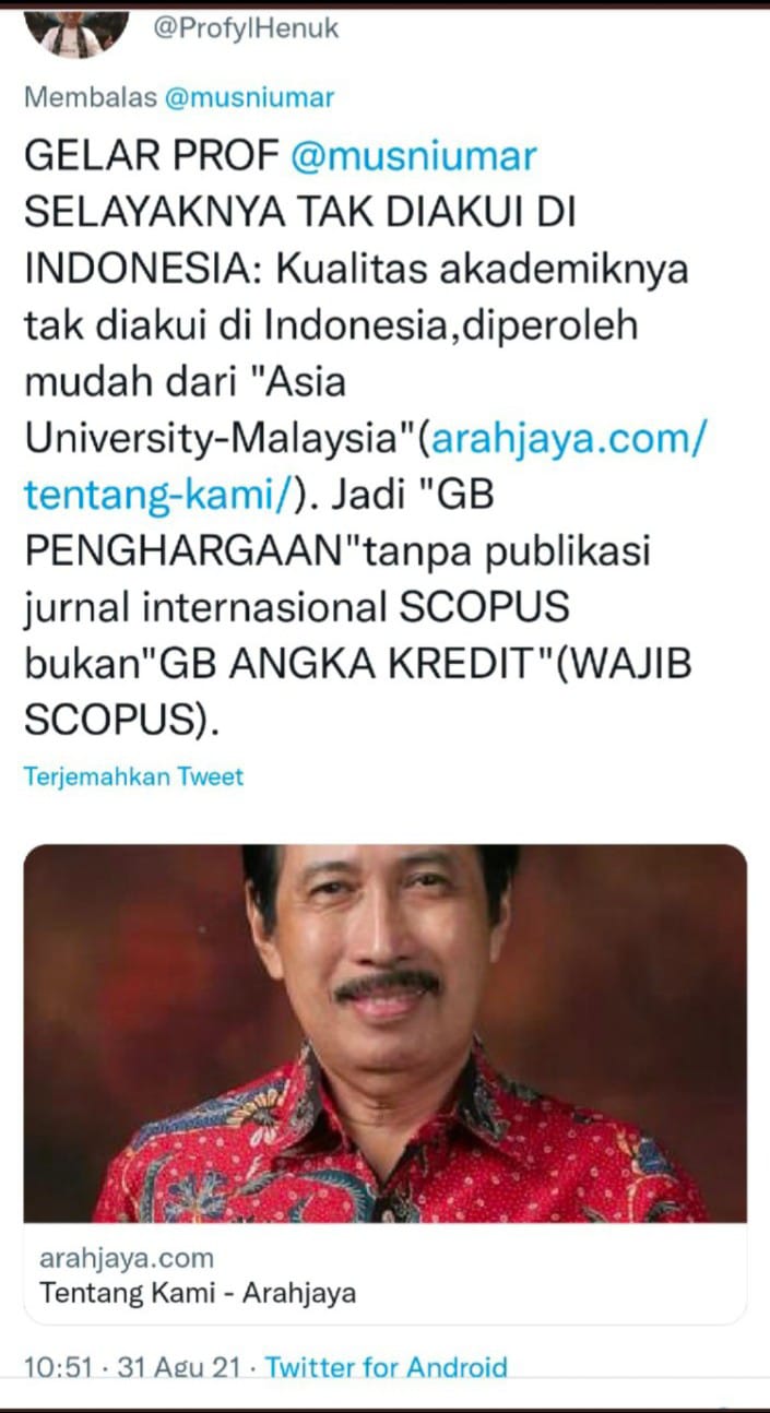 IGNews | Taput – Profesor Yusup Leonard Henuk sebelumnya telah melaporkan rektor Universitas Ibnu Chaldun Musni Umar ke Polda Metro Jaya terkait pemakaian gelar “Profesor”. Dilaporkan mengunakan pasal berlapis tentang perkara tindak pidana pemalsuan juncto menggunakan ijazah, sertifikat kompetensi, gelar akademik sebagaimana dimaksud dalam Pasal 263 KUHP juncto Pasal 69 Undang Undang (UU) Nomor 20 Tahun 2003 tentang Sistem Pendidikan Nasional (Sisdiknas) juncto Pasal 28 ayat 7 pada Pasal 93 UU Nomor 12 Tahun 2012 tentang Pendidikan Tinggi.