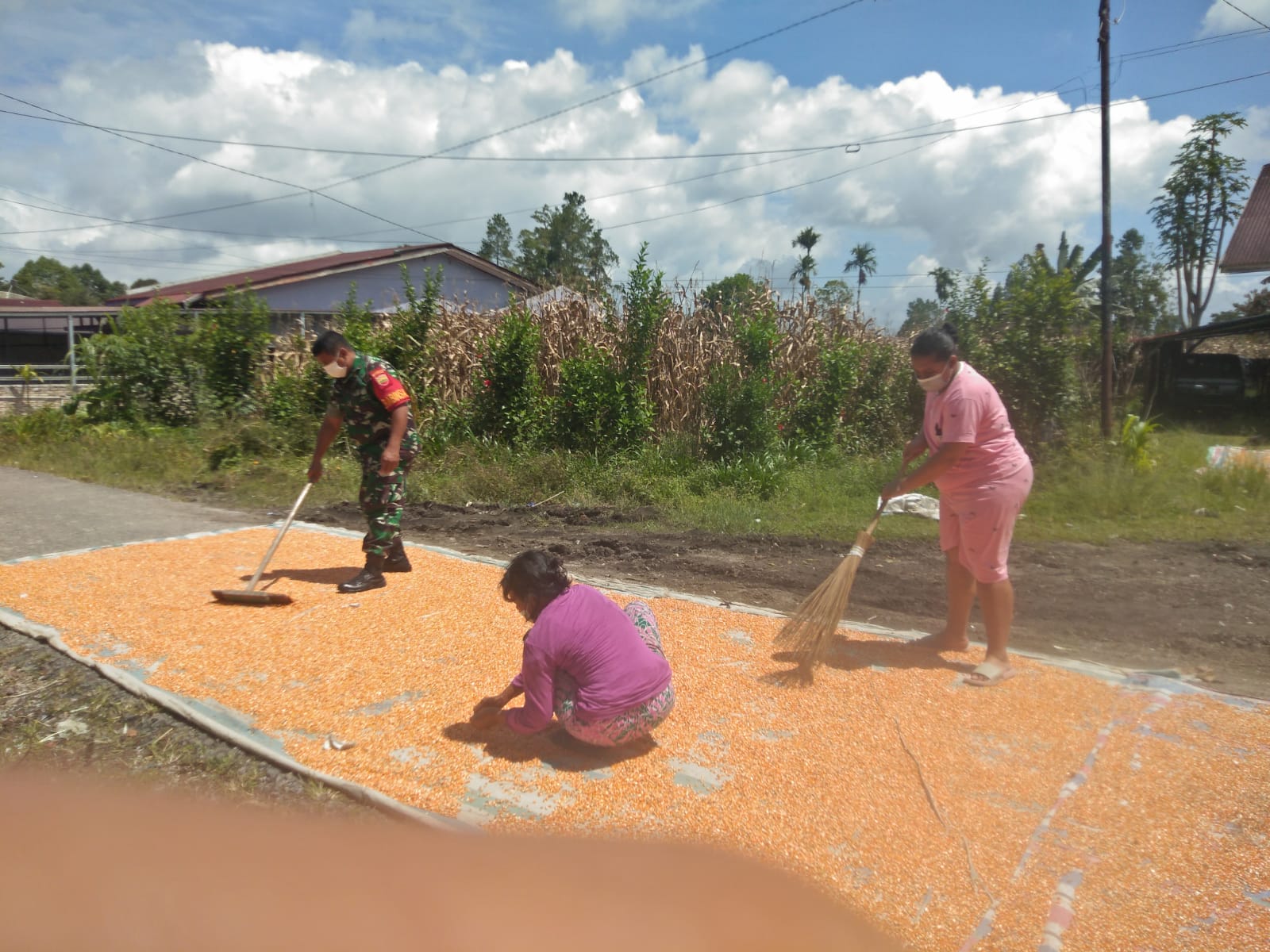 IGNews | Dairi – Babinsa Koramil 02/ Sidikalang jajaran Kodim 0206/ Dairi Serda Ibrahim Barus melaksanakan ketahanan pangan dengan kegiatan membantu petani menjemur jagung yang sudah selesai di panen dan dirontok milik Juniarita Sembiring (44), di Kelurahan Batang Beruh, Kecamatan Sidikalang Kabupaten Dairi – Sumatera Utara, Sabtu (2/4/2022).