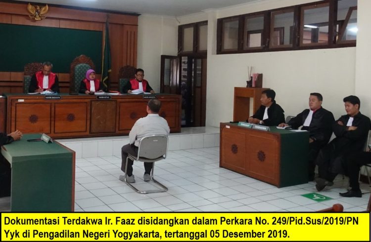 Seperti diketahui sebelumnya, dalam perkara No. 249/Pid.Sus/2019/PN Yyk, majelis hakim diketuai Ida Ratnawati SH MH menyatakan terdakwa Ir Faaz telah terbukti secara sah dan meyakinkan bersalah melakukan tindak pidana dengan sengaja dan tanpa hak mendistribusikan dan/atau mentransmisikan Informasi Elektronik dan/ atau Dokumen Elektronik yang memiliki muatan penghinaan dan/atau pencemaran nama baik, sebagaimana dalam dakwaan Penuntut Umum.