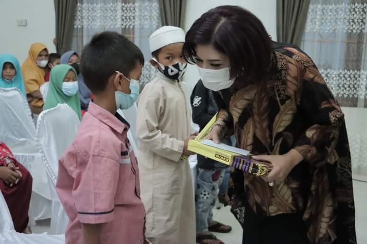 Dalam kesempatan yang sama Romy Mariani memberikan bingkisan sebagai simbol tali asih kepada anak anak yatim.