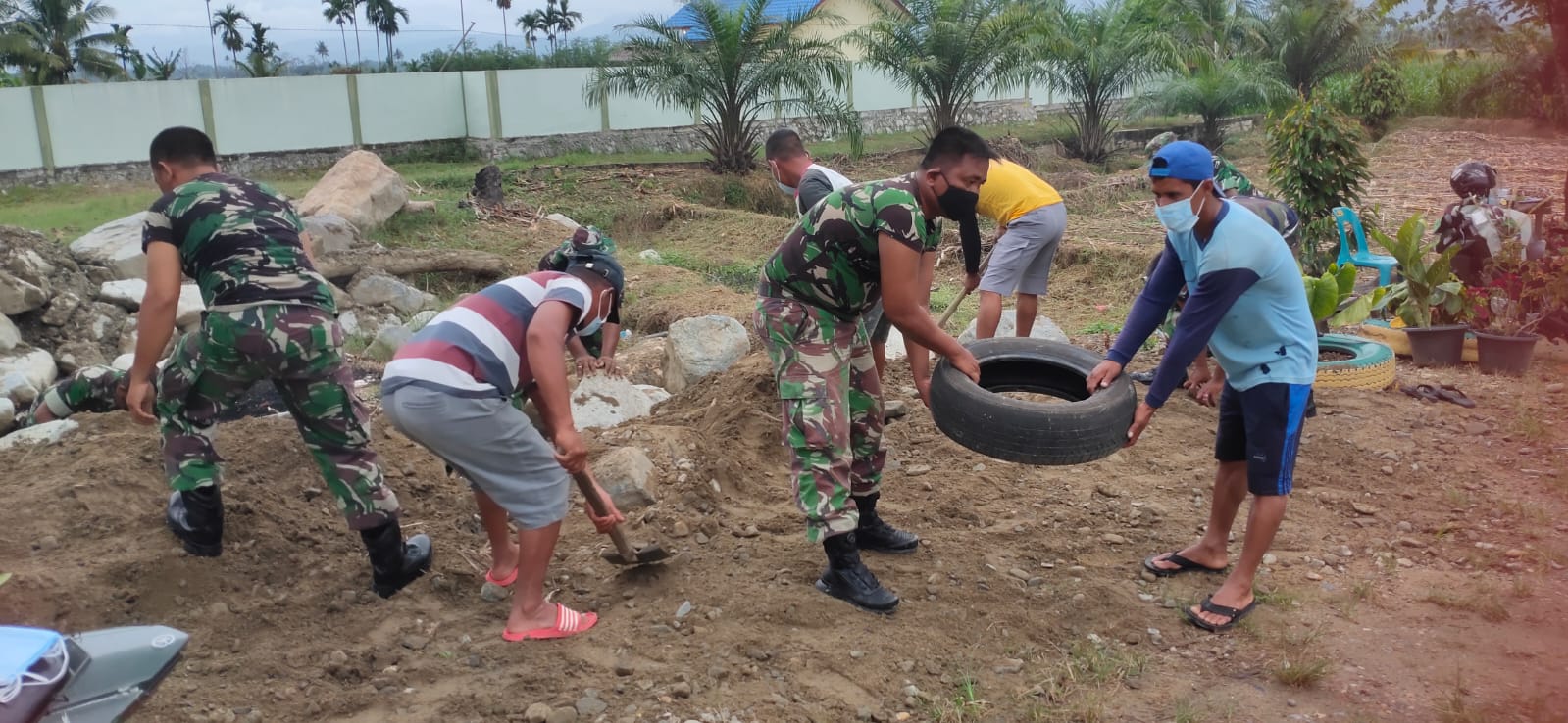 IGNews | Agara – Bina pemuda untuk melaksanakan olahraga bersama, anggota Koramil 07/ Semadam jajaran Kodim 0108/Agara, melaksanakan gotongronyong bersama masyarakat meratakan timbunan tanah untuk pembuatan lapangan bola voli di Desa Semadam Asal Kecamatan Semadam Kabupaten Aceh Tenggara, Jumat (13/5/2022).