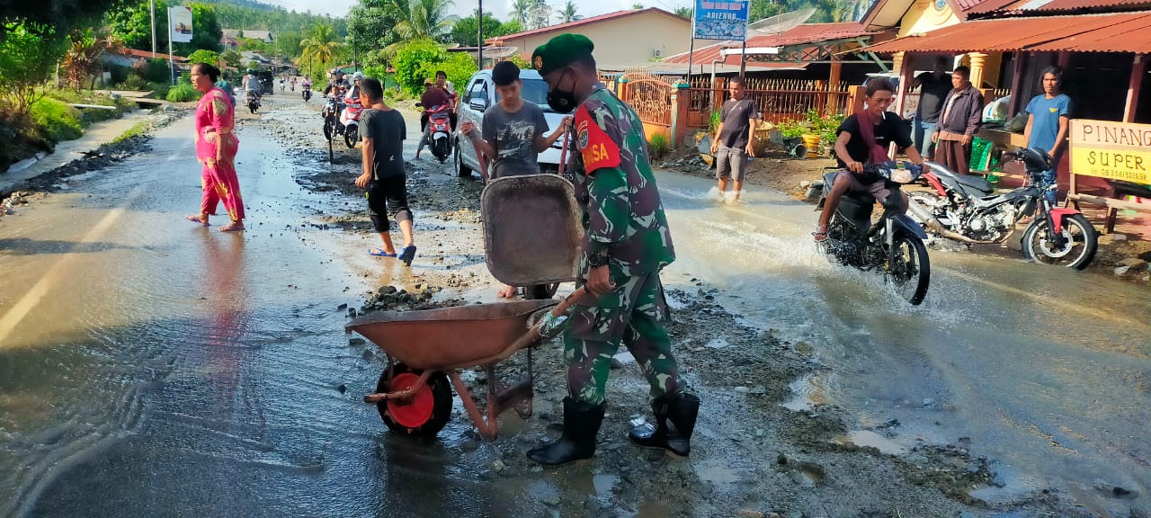 Anggota Koramil 07/ Semadam jajaran Kodim 0108/ Agara bersama warga saat gotongroyong pasca banjir, Minggu (15/5).