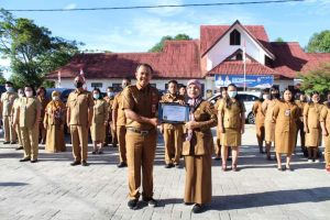IGNews | Dairi – Kepala Dinas Kependudukan dan Pencatatan Sipil (Dukcapil) Kabupaten Dairi, Deddy Situmorang SE, M.Si menyerahkan piagam penghargaan kepada Asrina Daulay sebagai pegawai teladan bulan April 2022, dihalaman parkir Dinas Dukcapil Dairi – Sumatera Utara, Senin (23/5/2022).