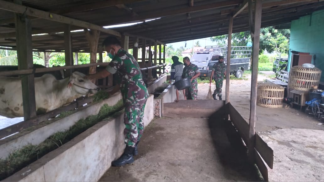 IGNews | Agara – Tidak memandang status sosial dalam memberikan bantuan terhadap warga masyarakat Desa binaan Babinsa Koramil 04/Babussalam, Sertu Halpiansyah bersama rekan rekanya membantu memberi pakan ternak warga milik Malik di Desa Pulonas, Kecamatan Babussalam, Kabupaten Aceh Tenggara, Kamis (26/5/2022).