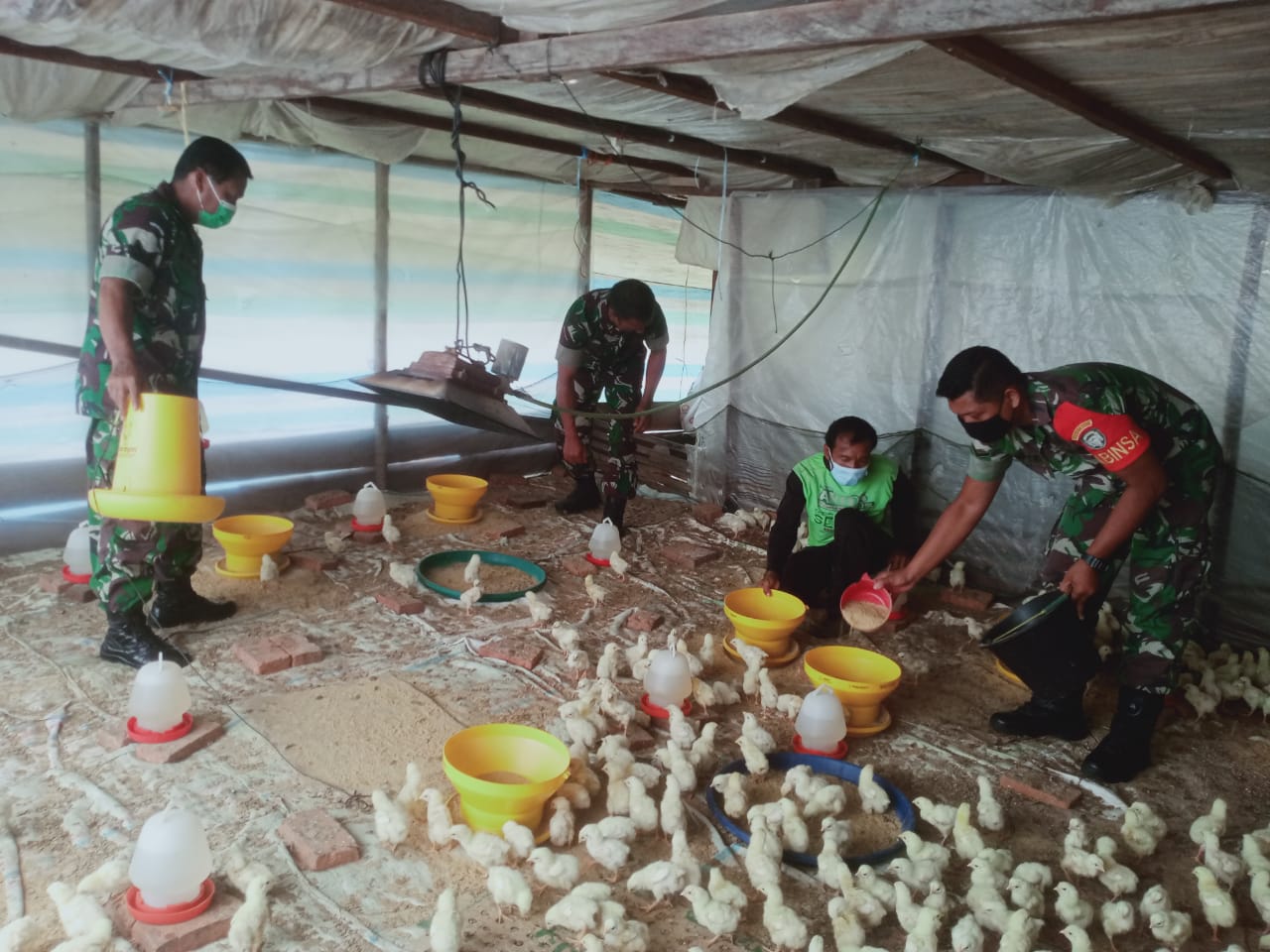 Dalam kunjunganya Babinsa ikut serta dalam membantu membersihkan kandang, memberi makan dan minum ternak agar kandang tersebut bersih dan ayam ayampun menjadi sehat.