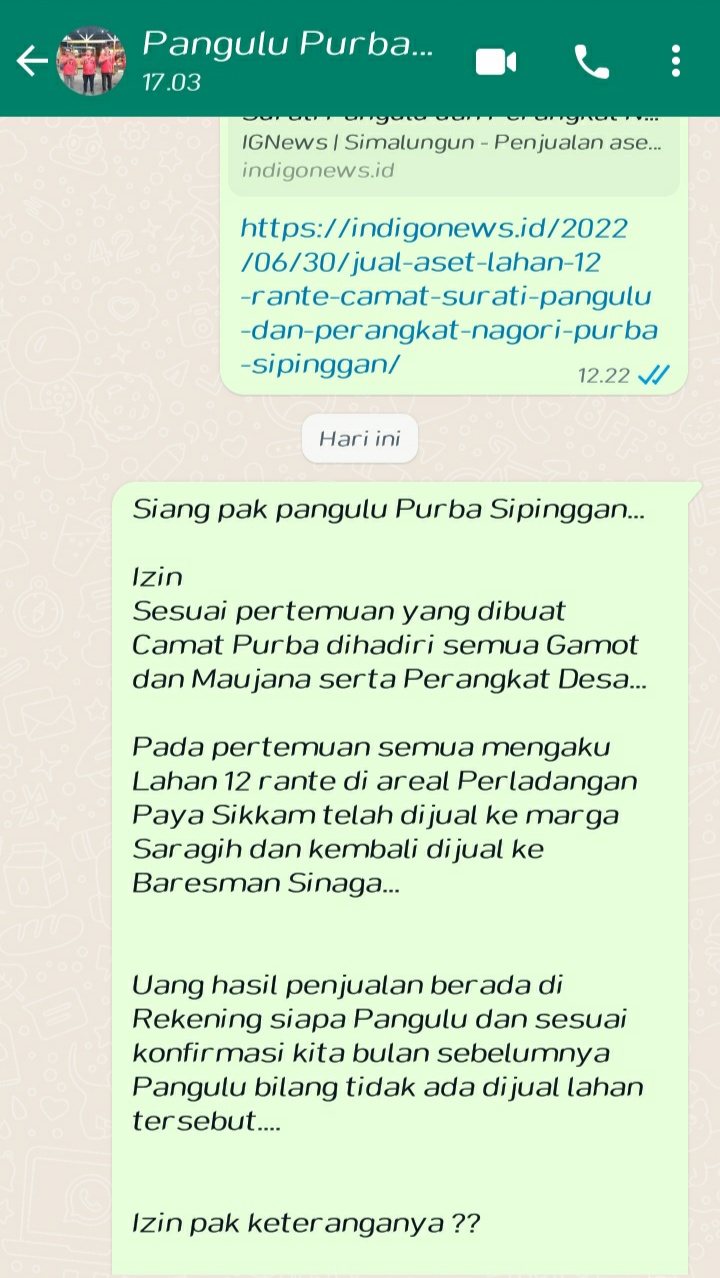 IGNews | Simalungun – Setelah mensapat informasi dari pemberitaan media online Indigonews Camat Purba, Bangun Siregar langsung menerbitkan surat dengan menggunakan kop surat resmi Pemerintahan Kabupaten Simalungun, Kecamatan Purba kepada Pangulu Nagori, Perangkat Nagori, Gamot dan Maujana Nagori Purba Sipinggan, Kecamatan Purba, Kabupaten Simalungun – Sumatera Utara untuk hadir dalam hal mendengar penjualan lahan 12 rante diareal perladangan Payasikkam, Dusun Sirpang Haranggaol yang diketahui aset Nagori Purba Sipinggan yang dahulunya dibeli dari marga Saragih, Jumat (1/7/2022).