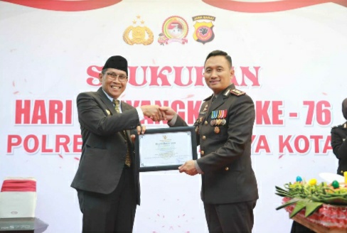 IGNews | Tasikmalaya – Saat syukuran hari Bhayangkara ke- 76, Wali Kota Tasikmalaya Drs. H. Muhammad Yusuf memberikan piagam penghargaan kepada Kapolres Tasikmalaya Kota, AKBP. Aszhari Kurniawan SH, SIK, M.Si dan jajarannya atas kinerja, dedikasi serta pengabdiannya dalam menjaga kondusifitas kamtibmas di Kota Tasikmalaya, Selasa (5/7/2022).