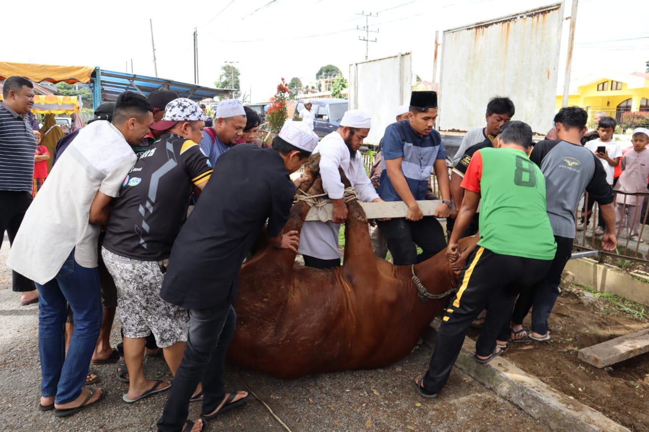 IGNews | Dairi – Bertempat di halaman parkir depan Poliklinik lama Polres Dairi Jalan Sisingamangaraja Nomor 08 Sidikalang, Kabupaten Dairi – Sumatera Utara setelah turun dari sholat idul adha, Polres Dairi melaksanakan penyembelihan hewan qurban yang terdiri dari 7 ekor Sapi, Minggu (10/7/2022).