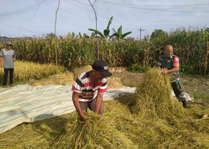 Babinsa dalam mendukung ketahanan pangan dengan semangat ikut serta terjun langsung ke sawah untuk membantu para petani desa binaannya saat memanen padi agar supaya terwujud kemanunggalan TNI dengan rakyat.