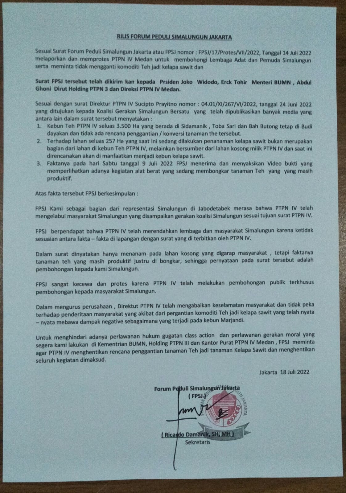 IGNews | Siantar – Forum Peduli Simalungun Jakarta (FPSJ) melalui surat nomor : FPSJ/ 17/ Protes/ VII/ 2022, melaporkan dan memprotes PTPN IV Medan untuk membohongi Lembaga Adat dan Pemuda Simalungun serta meminta tidak mengganti komoditi teh jadi kelapa sawit.