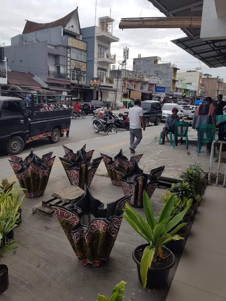 Pencinta Kota Balige ini menyumbang 7 unit pot bermotif gorga produk lokal dan bunga untuk ditempatkan di trotoar Jalan Sisingamangaraja, Kecamatan Balige, Kabupaten Toba – Sumatra Utara, Senin (25/7/2022).