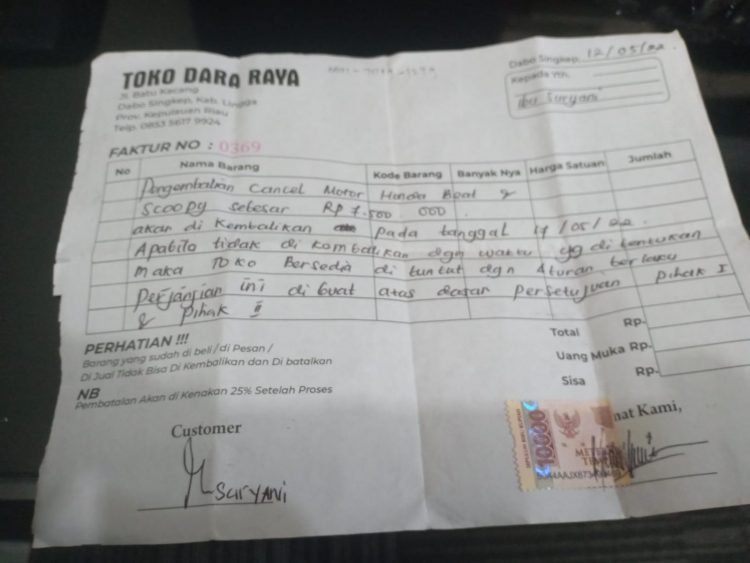 Terpisah, enam korban lainya menyampaikan keluh kesah kekecewaanya kepada FD selaku pemilik Toko Dara Raya telah menahun uang muka (DP) diberikan dengan bukti kwitansi namun sepeda motor yang dipesan tak kunjung diantarkan.