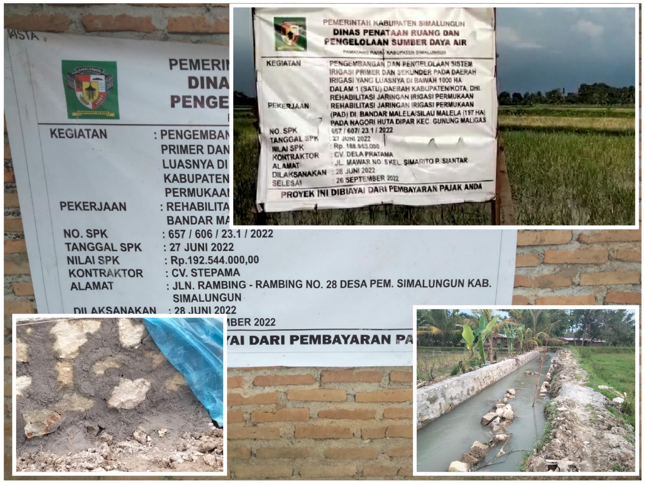 IGNews | Simalungun – Proyek rehabilitasi jaringan irigasi permukan di Nagori Huta Dipar, Kecamatan Gunung Malela, Kabupaten Simalungun dengan pagu anggaran Rp. 188.953.000 yang dikerjakan CV. Dela Pratama berkantor dijalan Mawar, Kelurahan Simarito, Kota Pametangsiantar dan di Nagori Silau Malela, Kecamatan Gunung Maligas dengan pagu anggaran Rp. 192.544.000 yang dikerjakan CV. Stepama beralamat dijalan Rambingrambing, Desa Pamatang Simalungun terlihat lemah pengawasan dari Dinas PSDA Kabupten Simalungun, sehingga kuat dugaan terjadinya pencurian kwantitas dan kwalitas bangunan.