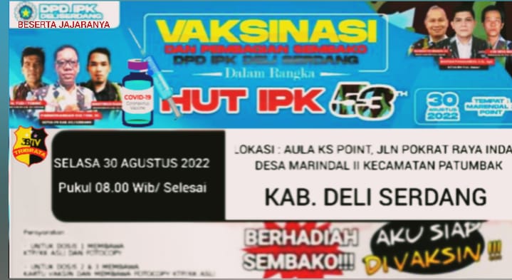 IGNews | Deliserdang – Sebagai bentuk rasa syukur dihari Ulang Tahun (HUT) Ikatan Pemuda Karya (IPK) yang ke 53 Tahun, DPD IPK Kabupaten Deliserdang beserta seluruh jajarannya akan mengelar Vaksinasi massal gratis 1, 2 dan 3 (boster) sekaligus pembagian sembako gratis, yang dilaksanakan di Aula KS Point, Jalan Pokrat Raya Indah, Desa Marindal II, Kecamatan Patumbak, Kabupaten Deliserdang – Sumatera Utara, Selasa (30/8/2022) pukul 08.00 Wib sampai dengan selesai.