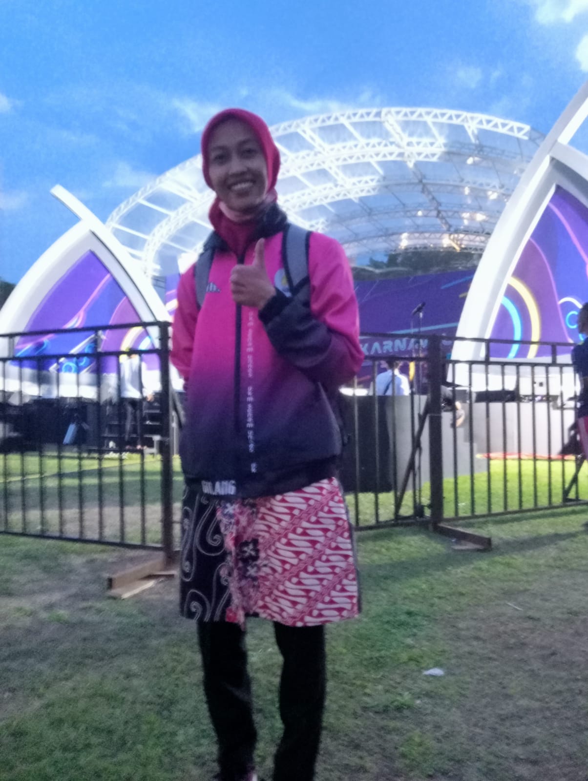 Mbak Anggi atau Mbak Ari sapaan wanita ini bersama teamnya bersemangat untuk mempersiapkan acara senam bersama esok pagi bersama ratusan peserta lainnya. Prestasi yang pernah dicapai Anggi sebagai pelatih diantaranya Juara 2 Lomba senam kreatif virtual antar Perguruan Tinggi tingkat Nasional.