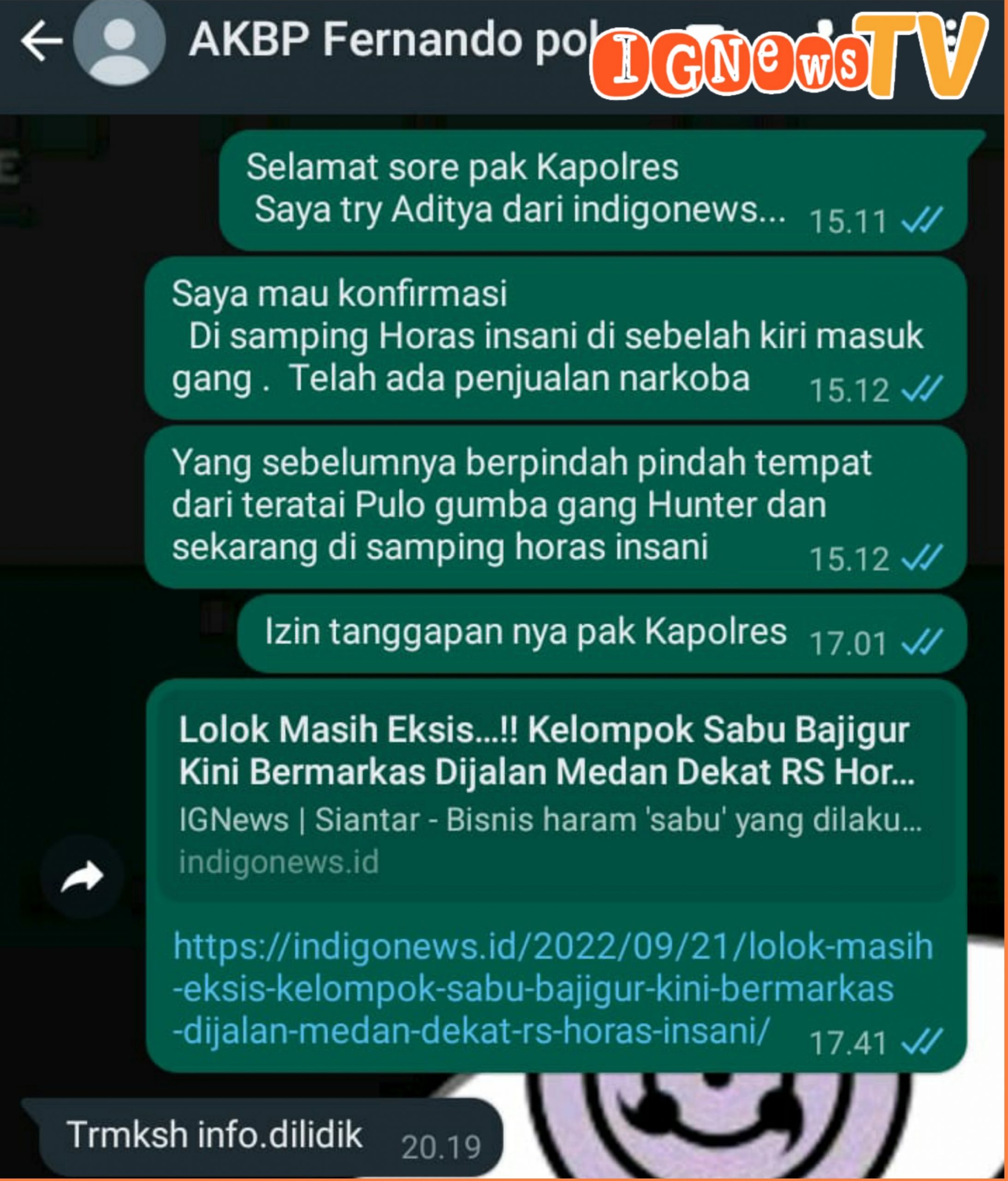 Jawaban pesan whatsapp Kapolres Pematangsiantar, AKBP Fernando dikonfirmasi reporter Indigonews, Sabtu (24/9).