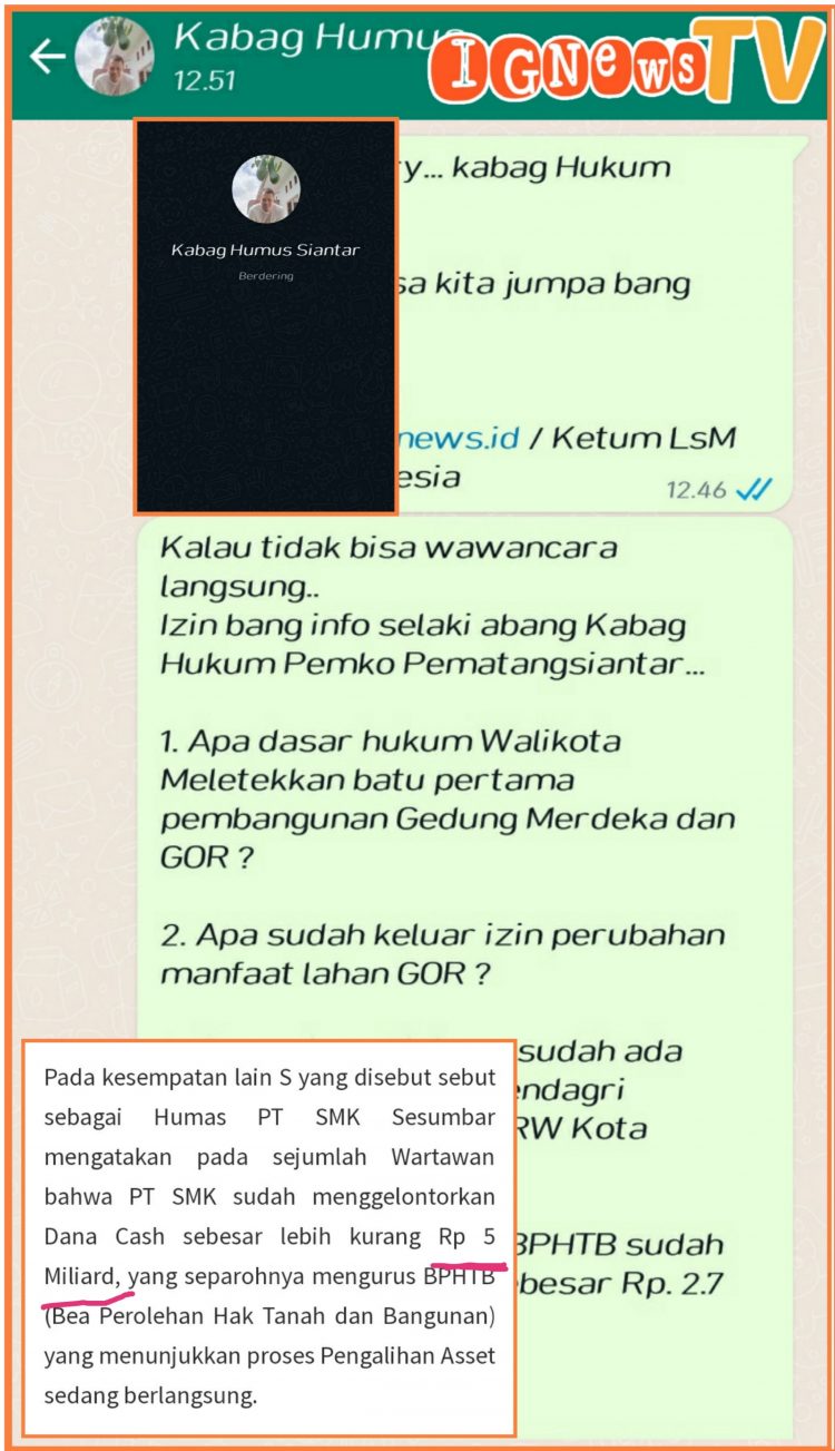 Kepala Bagian (Kabag) Hukum Pemerintahan Kota Pematangsiantar, Hery dikonfirmasi terkait dasar hukum Walikota Pematangsiantar melaksanakan peletakan batu pertama padahal.belum adanya izin gangguan lingkungan, izin alih fungsi GOR dan telah dibayarkanya BPHTB sebesar Rp. 2.7 Milair tetapi sampai berita ini dipublikasikan tidak bersedia memberikan jawaban.