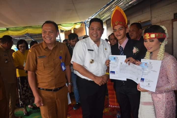 “Kami sudah siapkan akta kawin bagi pengantin dan juga kartu keluarga yang baru, KTP, serta perubahan KK yang baru untuk orang tua pengantin. Ini lengkap kami serahkan untuk menambah sukacita pada hari ini” ujar Bupati disambut dengan tepuk tangan warga yang hadir dalam pesta tersebut.