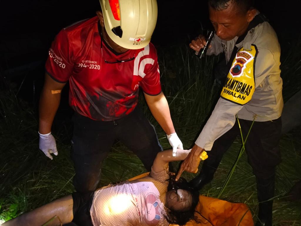 Personil Polsek Sragi dibantu Polsek Wiradesa, Tagana, PMI dan Elang Recue saat evakuasi mayat suhartini, Selasa malam (22/11).