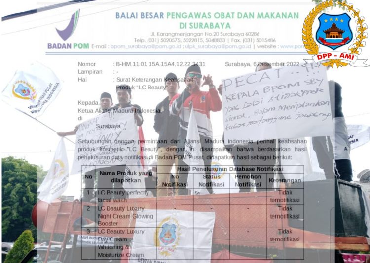 IGNews | Surabaya – Ramainya pemberitaan yang menyebutkan bahwasanya produk kosmetik dengan merk LC Beauty yang tidak mengantongi izin edar dari BPOM namun sudah berani menjual produknya selama 4 tahun ini bahkan sudah merebak luas, tentunya itu menjadi sorotan tersendiri bagi Aliansi Madura Indonesia (AMI).