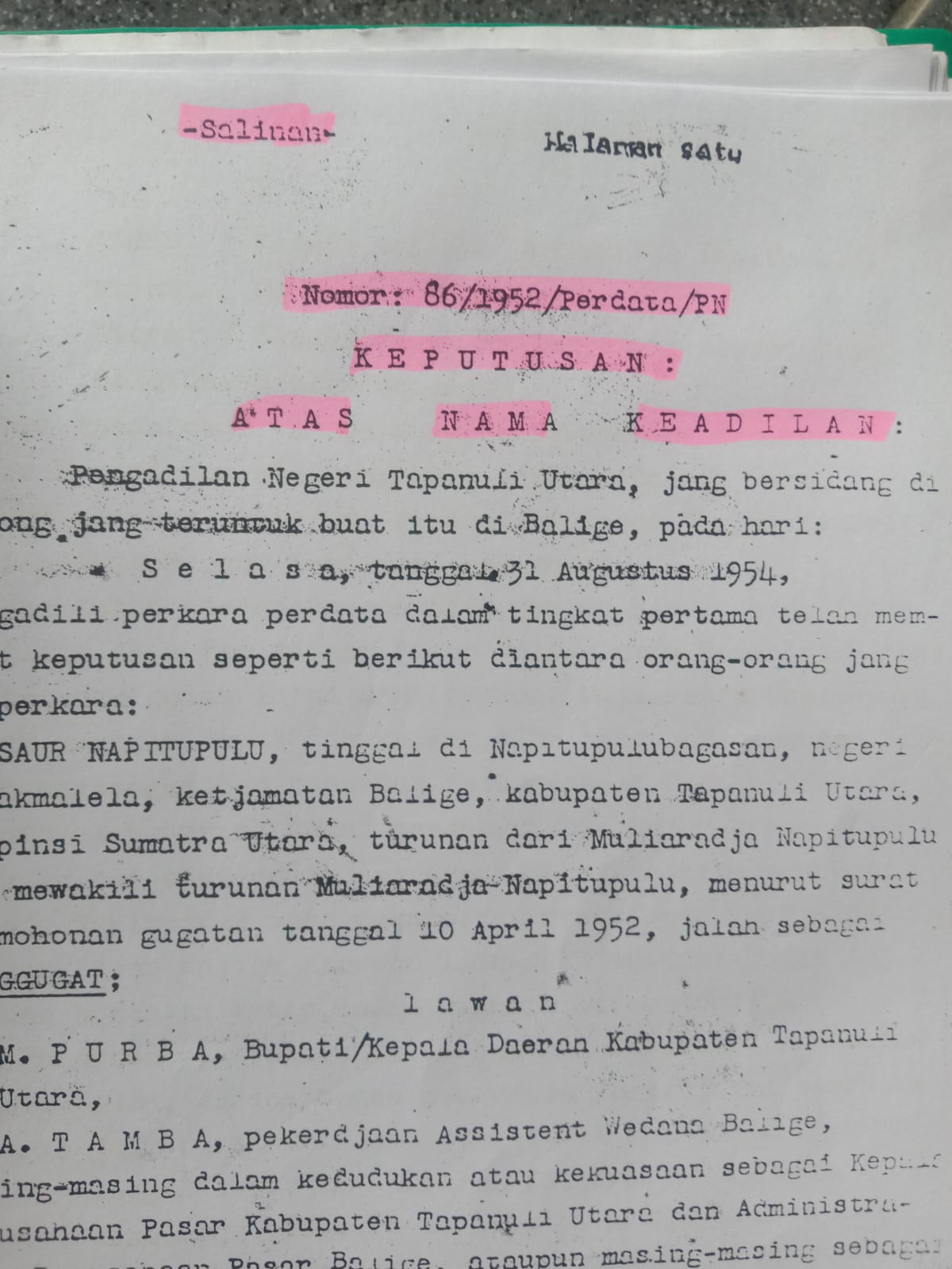 “Artinya yang dimohonkan ahli waris Maringan Napitupulu adalah sesuai salinan Keputusan Atas Nama Keadilan, Nomor: 86/ 1952/ Perdata/ PN, kemudian yang ditanggapi surat resmi oleh PN Tarutung seperti yang dimaksud Ketua PN Tarutung adalah salinan Putusan Nomor: 86/ Pdt G/ Perdata/ PN” terangnya.