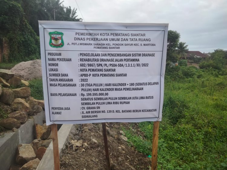 IGNews | Siantar – Dinas PUTR Kota Pematangsiantar lagi lagi tidak berfungsi, proyek program pengelolaan dan pengembangan sistim drainase maupun rehablitasi drainase dijalan Pertamin, Kelurahan Pondok Sayur, Kecamatan Martoba, Kota Pematangsiantar – Sumatera Utara luput dari pengawasan Panitia Pengawas Kegiatan (PPK) sehingga pihak dari rekanan CV Graha SN mempergunakan material bekas batu cadas .tepatnya didepan rumah warga yang berdampingan dengan ladang ubi, Kamis (22/12/2022).