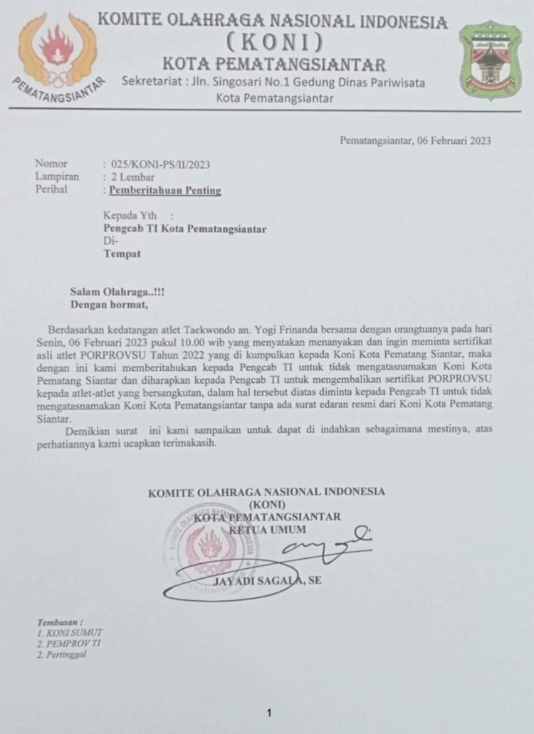 IGNews | Siantar – Terbitnya surat KONI Pematangsiantar Nomor: 025/ KONI-PS/ II/ 2023 tertanggal 06 Februari 2023 yang ditanda tangani Ketua KONI Pematangsiantar, Jayadi Sagala SE membuat berang Pengurus Kota (Pengkot) Taekwondo Indonesia Pematangsiantar, dimana surat tersebut tanpa crosscek dan tidak sesuai prosedural.