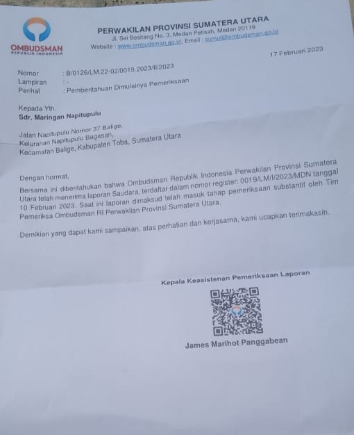 Djonggi Napitupulu mengatakan bahwa surat Ombudsman RI Perwakilan Sumut surat tertanggal 17 Februari 2023, Nomor: B/ 126/ LM.22-02/ 0019.2023/ II/b2023, Perihal : Pemberitahuan dimulainya Pemeriksaan.