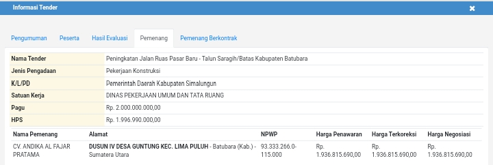 Penetapan pemenang tender juga terkesan adanya kecurangan dilakukan Dinas PUPR melalui Pokja ULPnya dimana terlihat pada situs resmi LPSE Kabupaten Simalungun ada beberapa perusahaan yang menetapkan nilai penawaran lebih rendah sekitar Rp. 100.000.000 dari CV. Andika yang notabene pemborong yang berkantor di Kabupaten Batu Bara.