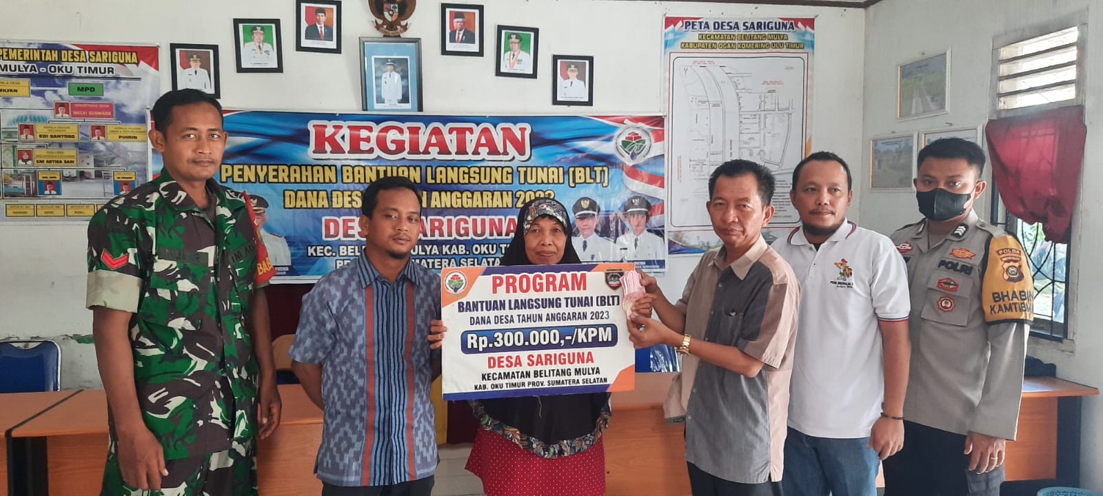 IGNews | OKU Timur – Kapolsek Belitang II, AKP. Aston L Sinaga diwakili Bhabinkamtibmas Desa Sariguna, BRIPTU. Azis Widodo SE hadiri penyaluran Bantuan Langsung Tunai (BLT) bersumber Dana Desa untuk bulan Januari, Februari dan Maret Tahun 2023, di Desa Sariguna, Kecamatan Belitang Mulya, Kabupaten OKU Timur – Sumatera Selatan, Sabtu (8/4/2023) pukul 10.00 Wib.