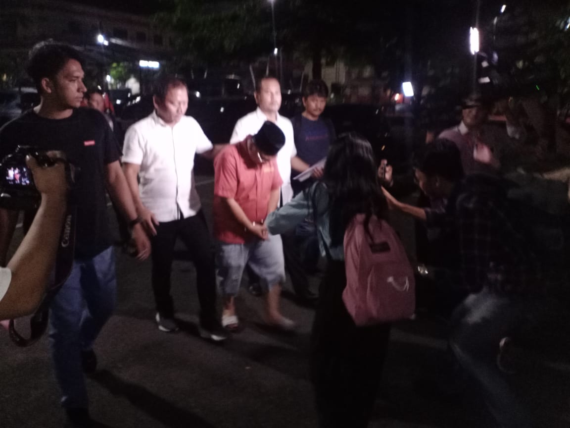 Dia hadir ke Polda Sumut sekitar pukul 12:48 Wib didampingi kuasa hukumnya terlihat mengenakan kemeja hijau lengan pendek, peci berwarna hitam masker berwarna hitam dan kacamata.