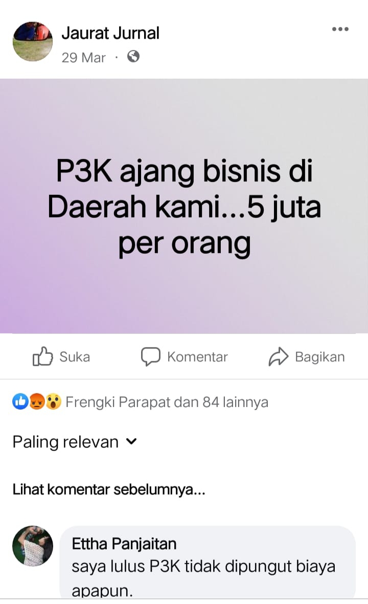 Kedatangan para P3K ASN tersebut terkait postingan akun Facebook Jaurat Jurnal yang menuliskan “P3K ajang bisnis di daerah kami…5 Juta per/ orang”.