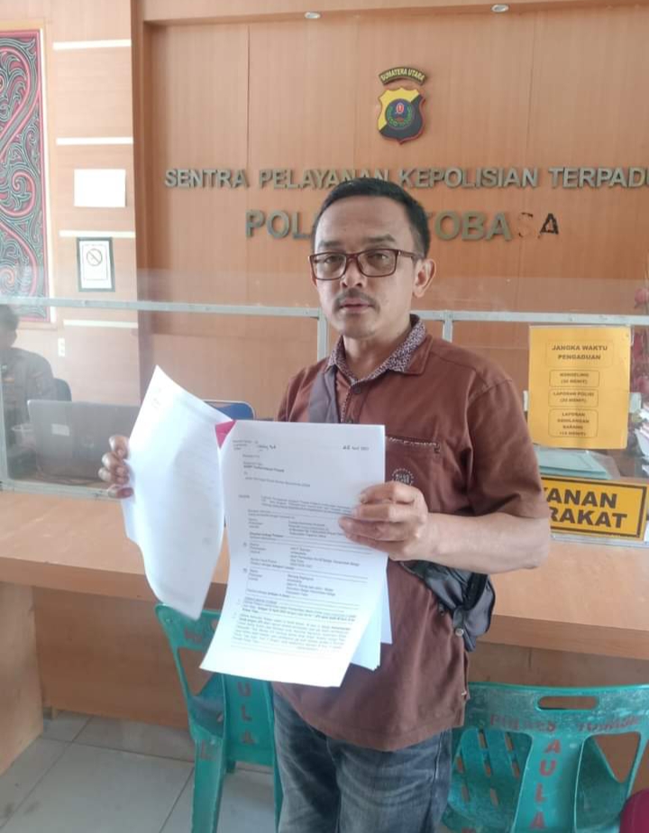 Korwil Sumut II Media Indigonews, Freddy Hutasoit saat antarkan laporan di Polres Toba, Selasa (25/4).