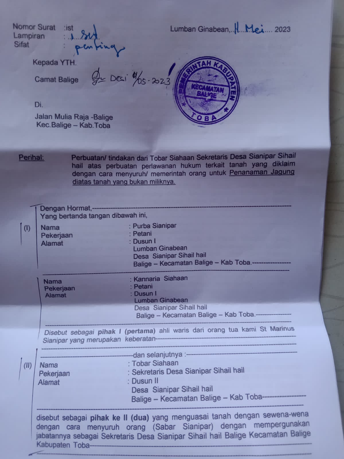 IGNews | Toba – Setelah surat tertanggal 2 Mei 2023 dilayangkan kepada Tobar Siahaan Sekretaris Desa Sianipar Sihail hail Balige yang ditembuskan kepada Panca P Sianipar Kepala Desa Sianipar Sihail hail Balige Kabupaten Toba, perihal perbuatan/ tindakan Tobar Siahaan atas perbuatan melawan hukum terkait tanah yang diklaim dengan cara menyuruh/ memerintah orang untuk penanaman jagung diatas tanah yang bukan miliknya.