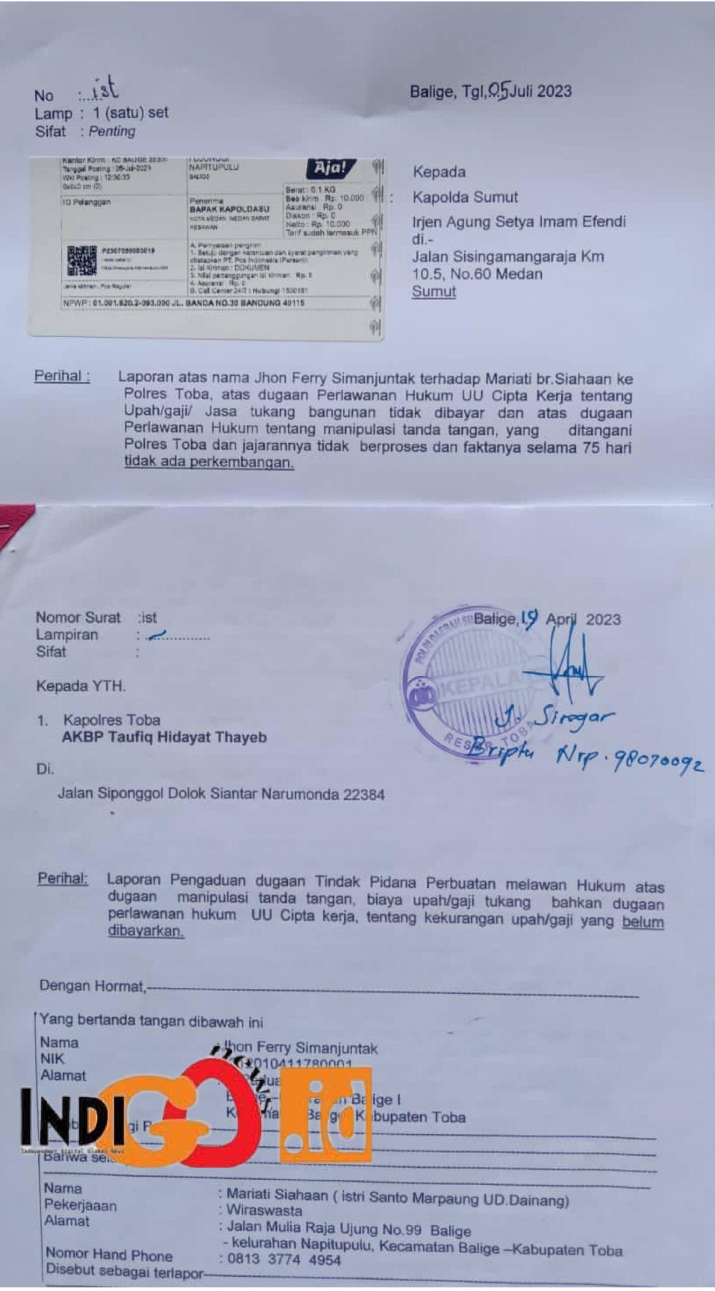 IGNews | Toba – Lagi, atas nama keluarga besar Simanjuntak yang diwakilkan kepada Ivan Djonggi Napitupulu yang dipercaya dari keluarga korban Jhon Ferry Simanjuntak terkait laporan terhadap M br S ke Polres Toba melalui Dumas tanggal 19 April 2023 silam atas dugaan perlawanan hukum, perbuatan tanda tangan palsu dan dugaan perlawanan hukum UU Cipta Kerja tentang upah/ gaji/ jasa tukang bangunan tidak dibayar pihak UD.D atas pengerjaan penambahan bangunan rumah tinggal milik SG dijalan Mulia Raja Ujung Balige sudah memakan waktu 75 hari ditangani Polres Toba dan jajarannya, belum terlihat perkembangannya sudah sampai dimana proses hukumnya.