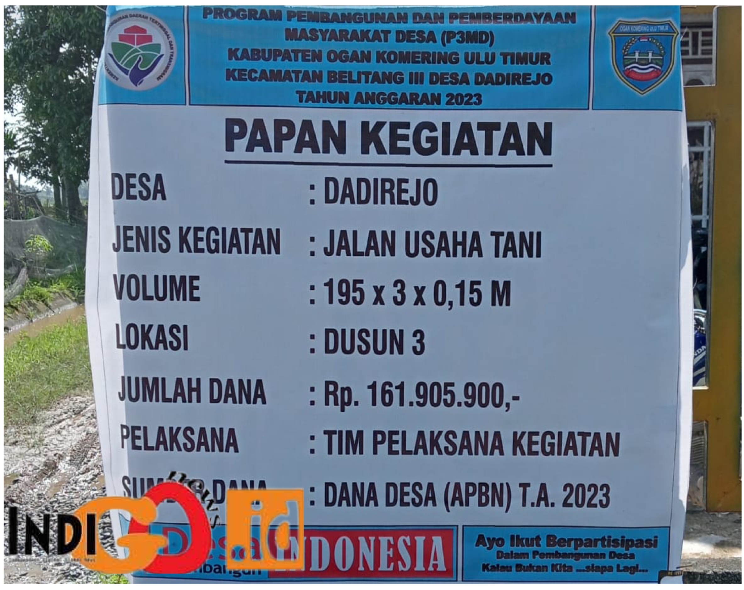 IGNews | OKU Timur – Bangunan Jalan Usaha Tani dengan rabat beton di Desa Dadirejo, Kecamatan Belitang lll, Kabupaten OKU Timur – Sumatera Selatan kini sudah dimulai dilaksanakan, dengan volume 195 Meter x 3 Meter x 0.15 CM dikerjakan tepatnya di Dusun 3 Desa Dadirejo, Selasa (11/7/2023).