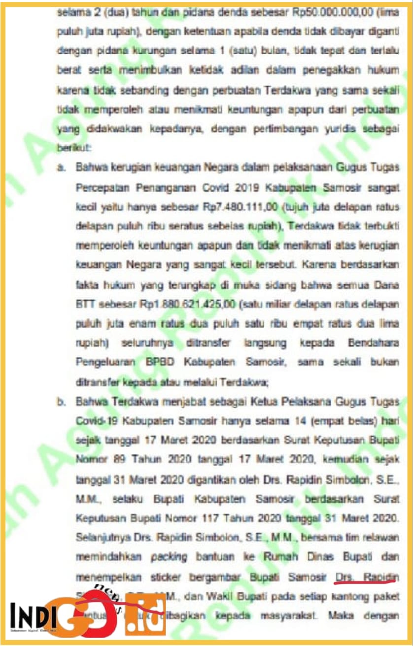 Rapidin Simbolon disebut dalam putusan tersebut bersama tim relawan memindahkan Packing ke Rumah Dinas Bupati dan menempatkan sticker bergambar Bupati dan Wakil Bupati pada setiap kantong paket bantuan Covid- 19 yang akan dibagikan kepada masyarakat.