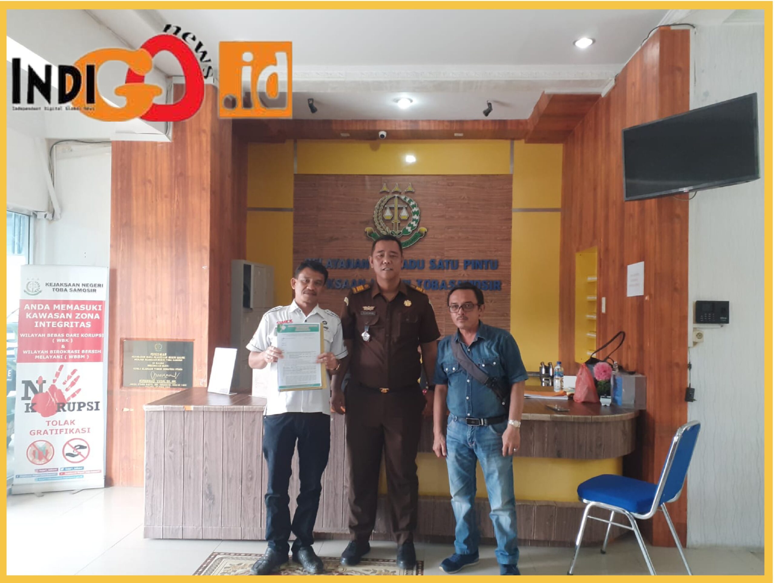 Djonggi Napitupulu bersama reporter Indigonews saat mengantar laporan yang langsung diterima  Kasi Intel Kejari Taput, Kamis (14/9).