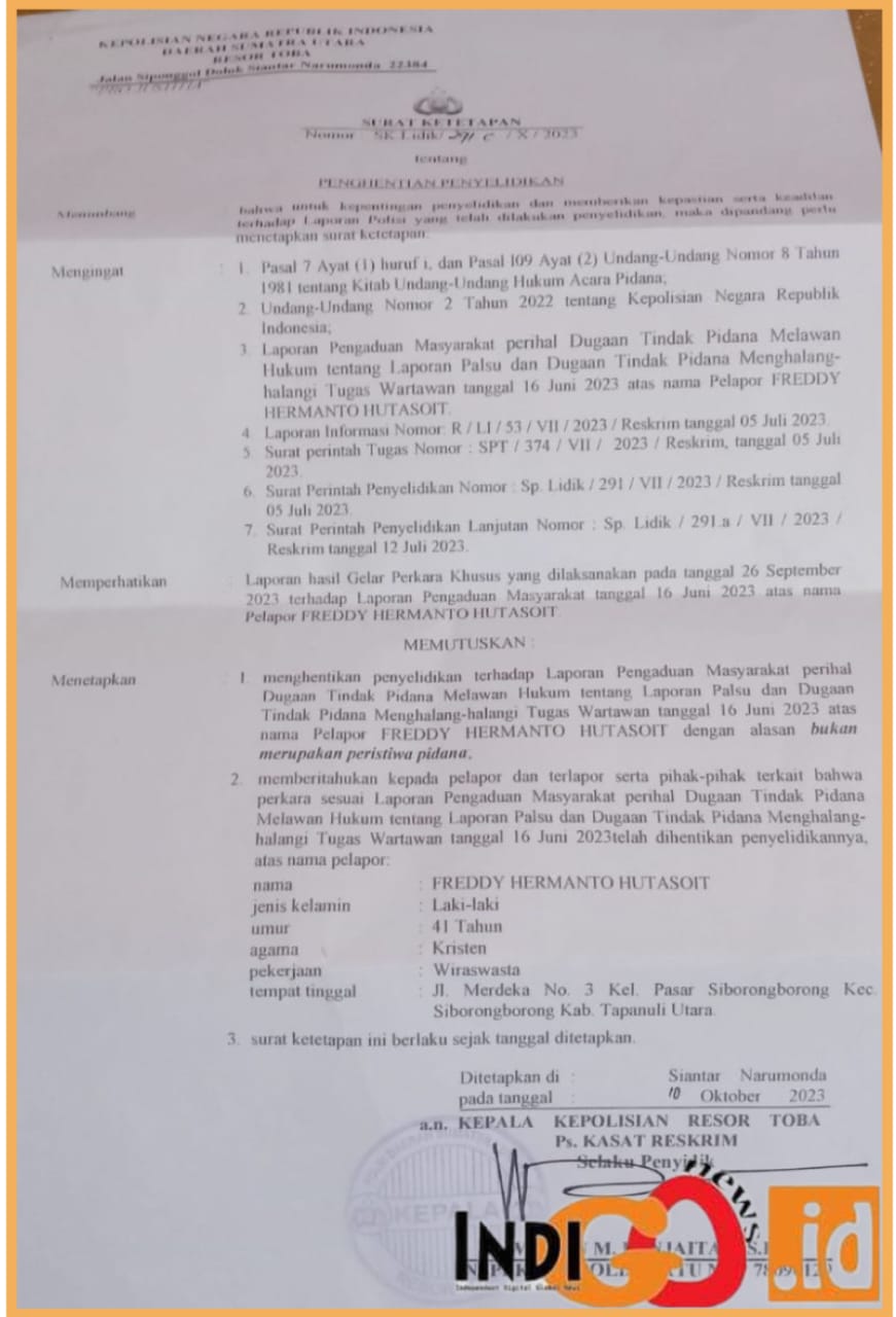 IGNews | Toba – Surat Polres Toba tanggal 14 Oktober 2023 perihal Pemberitahuan Perkembangan Penelitian Laporan yang diterima Freddy H Hutasoit, Korwil Sumut II – Tapanuli Raya Media Online Indigonews. Membaca, meneliti dan menganalisa, surat yang dimaksud menyatakan bahwa dalam angka (2) huruf (a) menyatakan bahwa Laporan SM bukan merupakan laporan palsu sesuai, Pasal 317 KUHP yang berbunyi : “Barang siapa dengan sengaja mengajukan pengaduan atau pemberitahuan palsu kepada penguasa, baik secara tertulis maupun untuk dituliskan, tentang seseorang sehingga kehormatan atau nama baiknya terserang”, Jumat (20/10/2023).