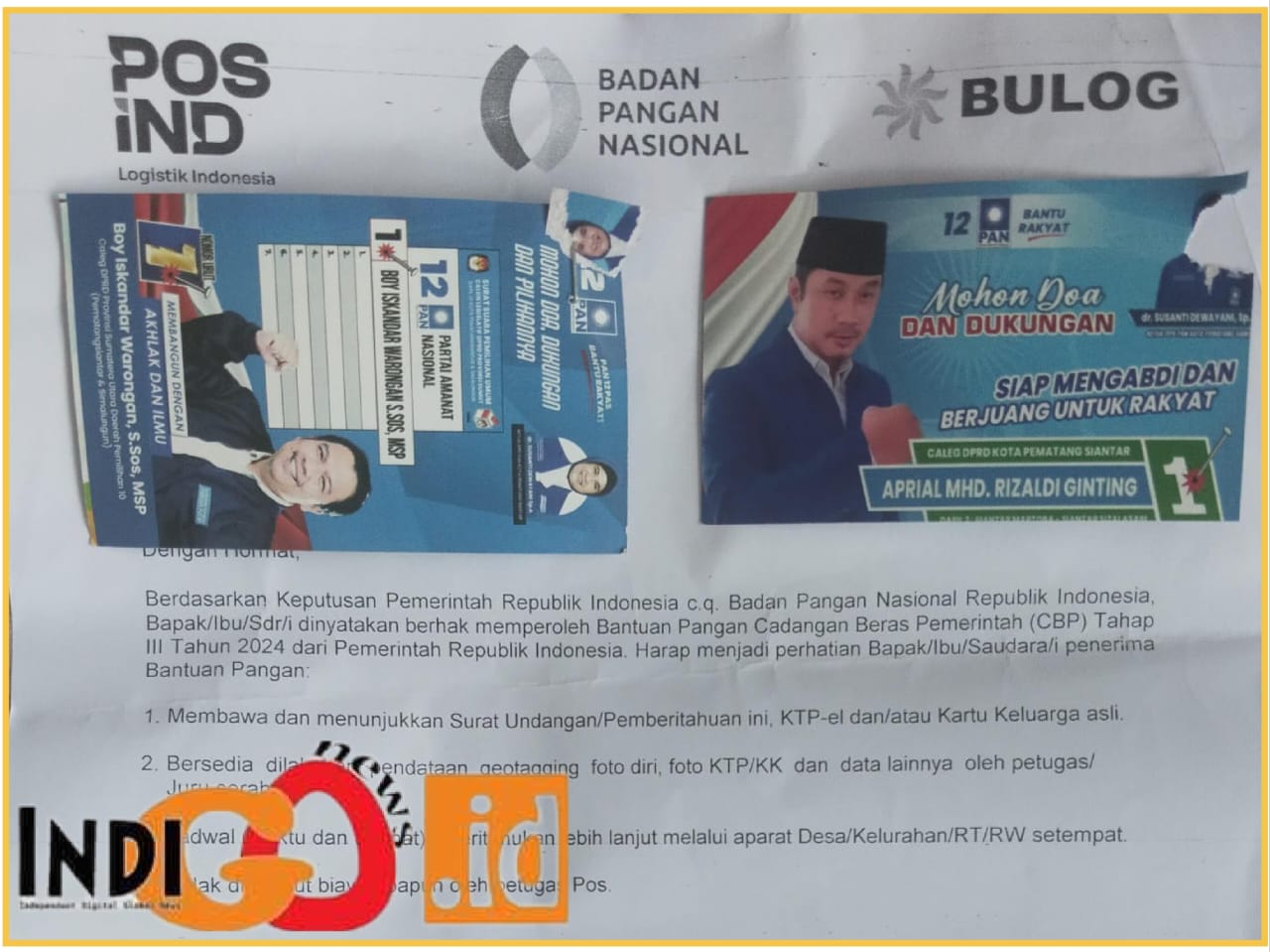 Kedua Caleg, konon katanya diduga menggunakan undangan yang dibagikan kemasyarakat penerima bantuan pangan tahap III berupa Cadangan Beras Pemerintah, penerima surat undangan yang akan ditebus di Kantor Pos hanya masyarakat yang bersedia memilih kedua Caleg.