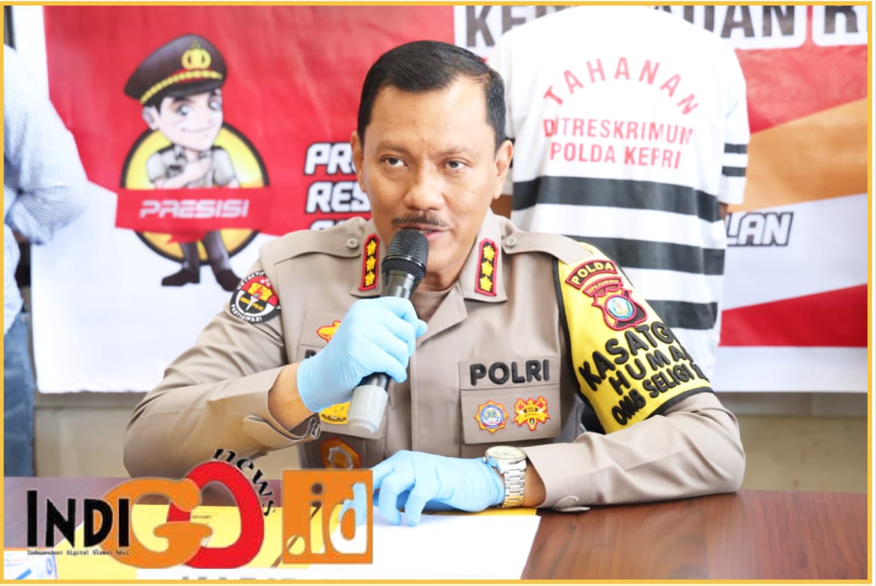 Kabidhumas Polda Kepri, Kombes. Pol. Zahwani Pandra Arsyad SH, M.Si didampingi Dirreskrimum Polda Kepri, Kombes. Pol. Adip Rojikan SIK, MH dan Kasubdit 3 Jatanras Ditreskrimum Polda Kepri, Kompol. Mikael Hutabarat SH, SIK, MH pada saat Konferensi Pers di Lobby Ditreskrimum Polda Kepri, Kamis (14/3/2024).