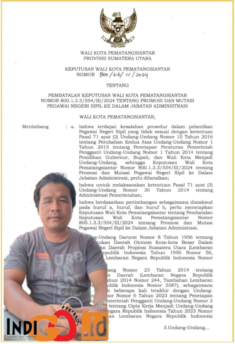 iGNews | Siantar – Walikota Pematangsiantar, Susanti Dewayani menerbitkan surat keputusan Nomor 800/ 616/ IV/ 2024 tentang pembatalan Surat Keputusan Nomor 800.1.3.3/ 554/ III/ 2024, hal ini menunjukkan bahwa Walikota sadar akan kesalahanya atas pelantikan 92 pejabat di Lingkungan Pemerintahan Kota Pematangsiantar.