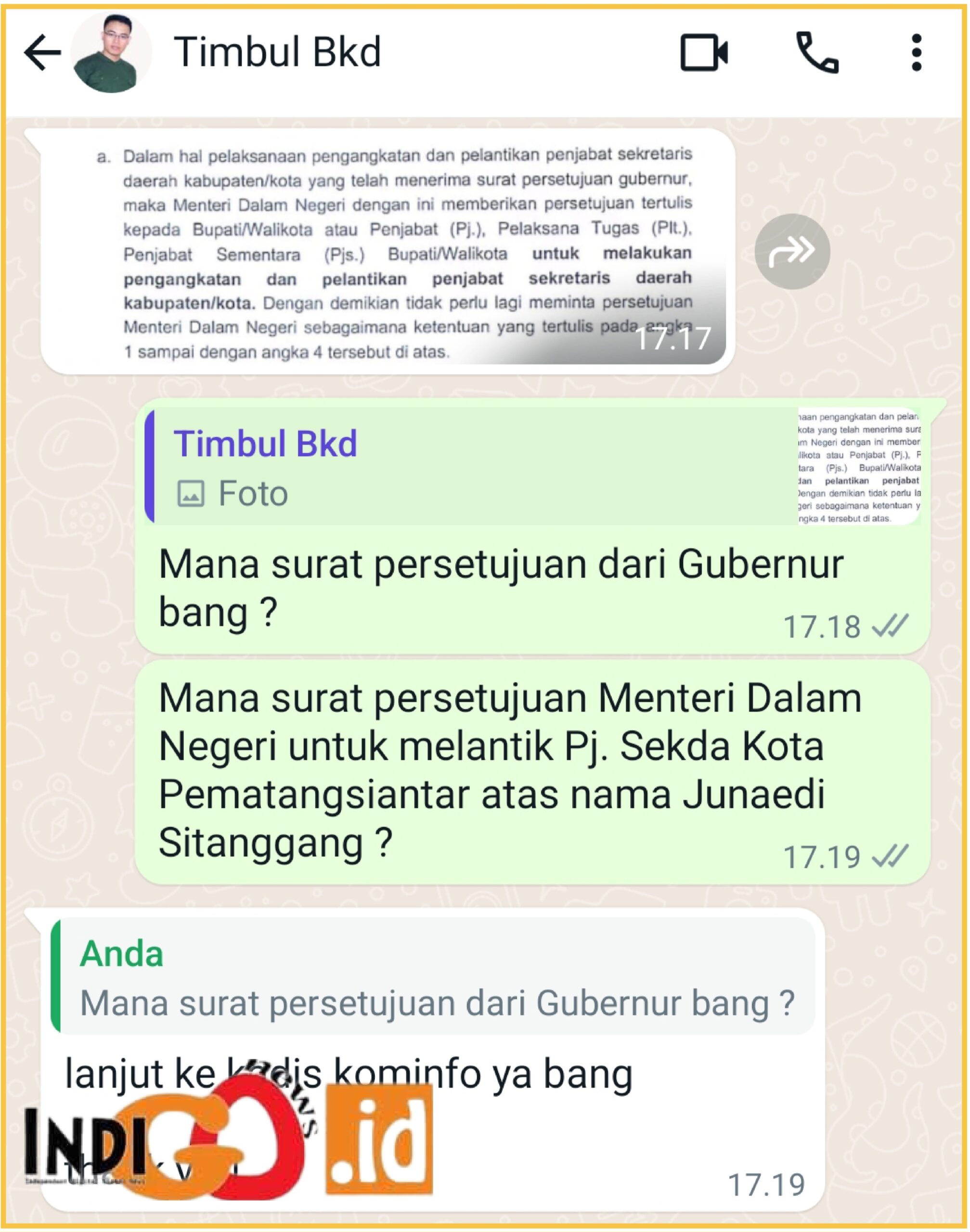 Namun saat kembalk didesak mana Surat Persetujuan Gubernur dan Mendagri atas pelantikan Junaedi Sitanggang menjadi Penjabat (Pj) Sekda Kota Pematangsiantar, Timbul Simanjuntak malah menjawab “Lanjut ke kadis kominfo ya bang….thank you“.