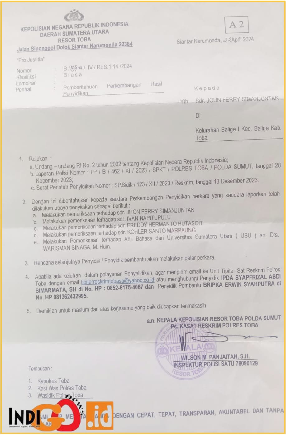 IN alias Djonggi Napitupulu mengatakan untuk diketahui dalam surat yang dimaksud angka 2 menyatakan bawa penyidik telah melakukan pemeriksaan terhadap JFS, IN, FHH dan penyidik telah melakukan pemeriksaan terhadap oknum terlapor KSM pengusaha UD.D Balige serta penyidik telah melakukan pemeriksaan terhadap ahli bahasa dari Universitas Sumatera Utara, Drs. Warisman Sinaga M.Hum.