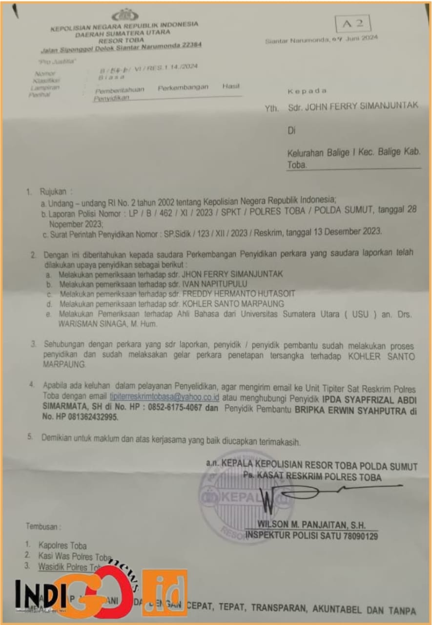 iGNews | Toba – Terkait laporan JFS terhadap KSM sipedagang Galian C dan juga pengusaha Panglong UD.D Balige dengan laporan Nomor: LP/ B/ 462/ XI/ 2023/ SPKT/ Polres Toba/ Polda Sumut, tanggal 28 Nopember 2023, penyidik dan atau penyidik pembantu sudah melakukan proses penyidikan dan sudah melaksanakan gelar perkara penetapan tersangka terhadap terlapor KSM. Demikian surat tanggal 4 Juni 2024, Nomor: B/ 135-b/ VI/ Res.1.14/ 2024 perihal pemberitahuan perkembangan hasil penyidikan, Jumat (7/6/2024).