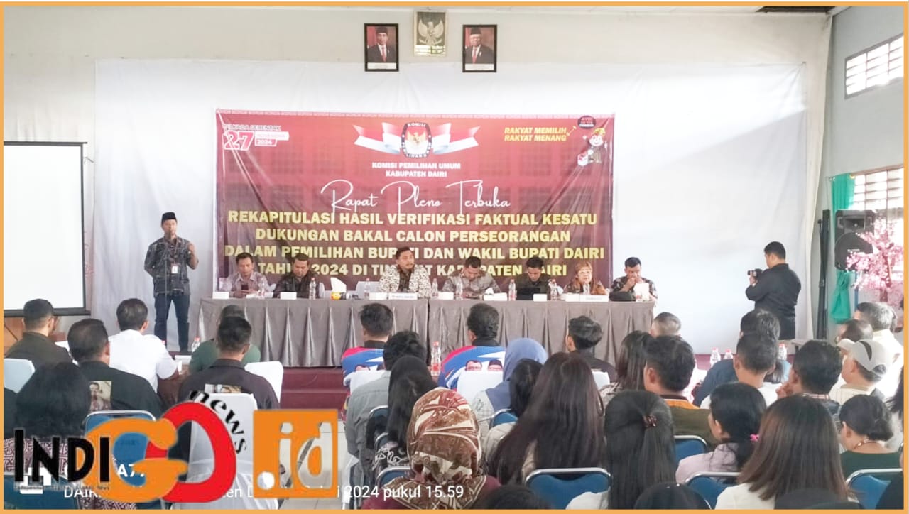 iGNews | Sidikalang – KPU Dairi melaksanakan rapat pleno rekapitulasi hasil verifikasi faktual Calon Perseorangan Bupati dan Wakil Bupati Dairi Tahun 2024 tingkat Kecamatan, rapat pleno di gelar secara terbuka di O’nes Hotel Sidikalang, Kabupaten Dairi – Sumut, Rabu (10/7/2024).