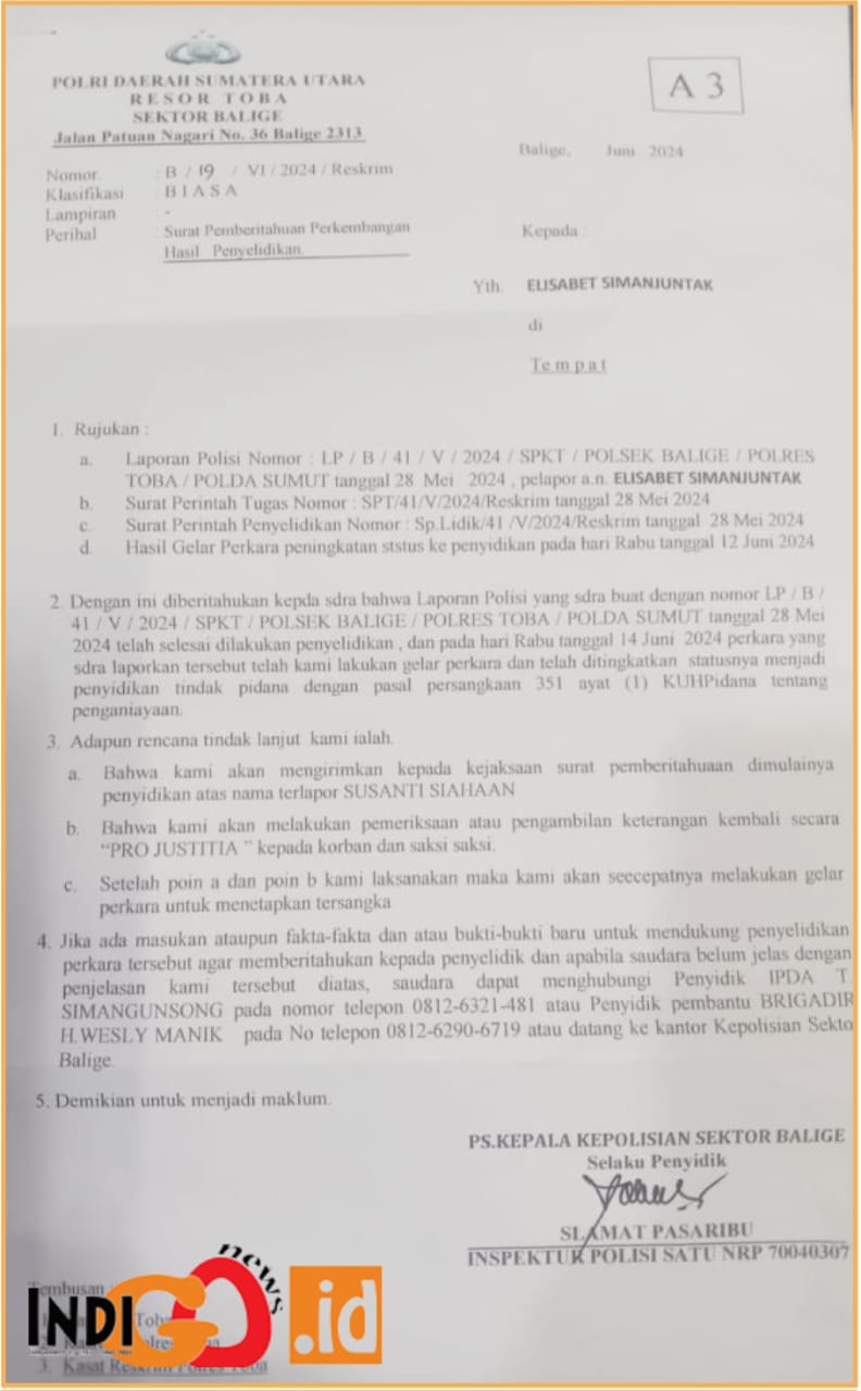 iGNews | Toba – Penyidik Polsek Balige, Brigadir Wesly Manik SH dan Kanit IPDA. Tarsan Simangunsong SH telah  berkunjung untuk menghadap  kepada Kasi Pidum Kejaksaan Negeri Tobasa terkait berkas  Laporan  ES terhadap SS  dengan Laporan Polisi Nomor: LP/ B/ 41/ V/ 2024/ SPKT/ Polsek Balige/ Polres Toba/ Polda Sumut tertanggal 28 Mei 2024 tentang Tindak Pidana Penganiayaan. Demikian  Penyidik Polsek Balige, Wesly Manik mengatakan kepada Djonggi Napitupulu suami dari  korban ES  melalui selulernya dalam menyikapi penelitian berkas sudah 14 hari di Kejari Tobasa, Sabtu (27/7/2024).
