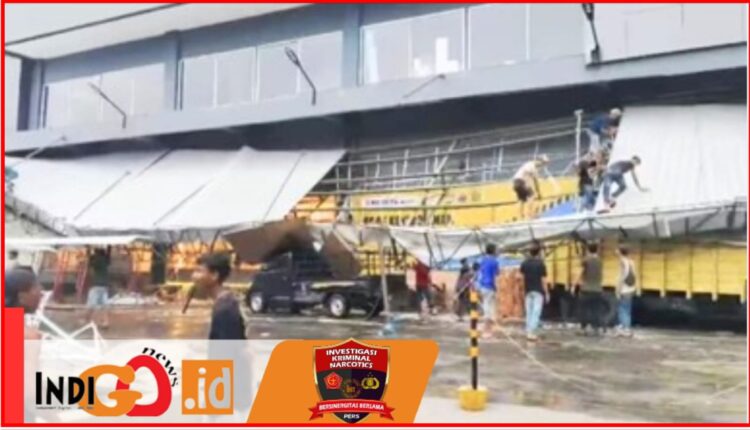 Konstruksi baja ringan kerangka kanopi beserta atap yang ambruk sepanjang puluhan meter menimpa satu unit truk cold diesel dan mobil pick up grandmax terjadi saat hujan tuurun sekitar pukul 14.55 Wib.