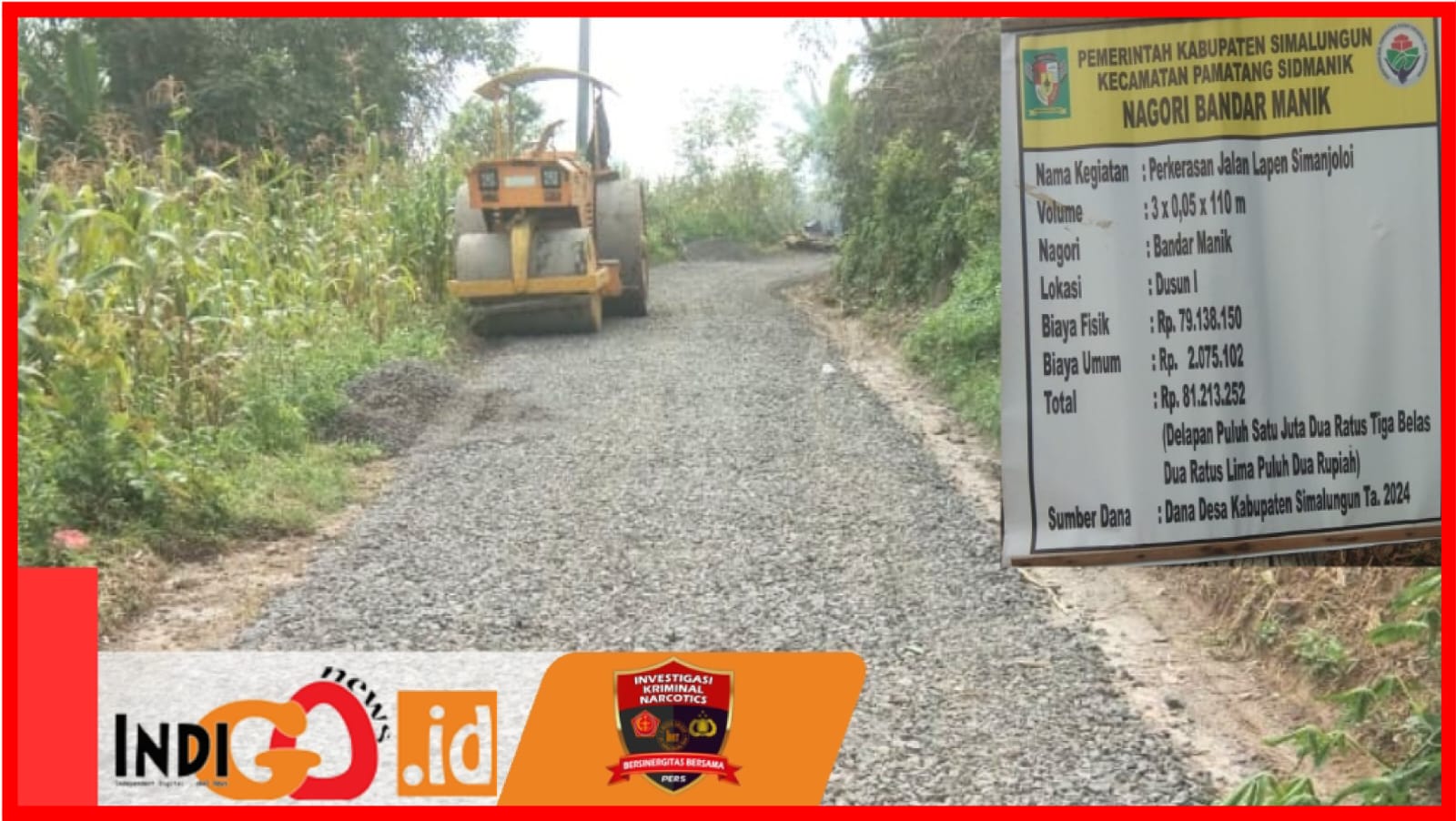 iGNews | Simalungun – Proyek perkerasan jalan lapen di Dusun Simanjoloi, Nagori Bandar Manik, Kecamatan Pematang Sidamanik, Kabupaten Simalungun – Sumut bersumber dari Dana Desa Tahun Anggaran 2024 dengan pagu anggaran Rp. 81.213.252 dengan volume kegiatan lebar 3 Meter, ketebalan 0.05 Meter dan panjang 110 Meter terkesan adanya pencurian kwalitas dan kwantitas baik pengurangan matrial batu dan pengurulangan pemakaian aspal cair, Kamis (5/12/2024).