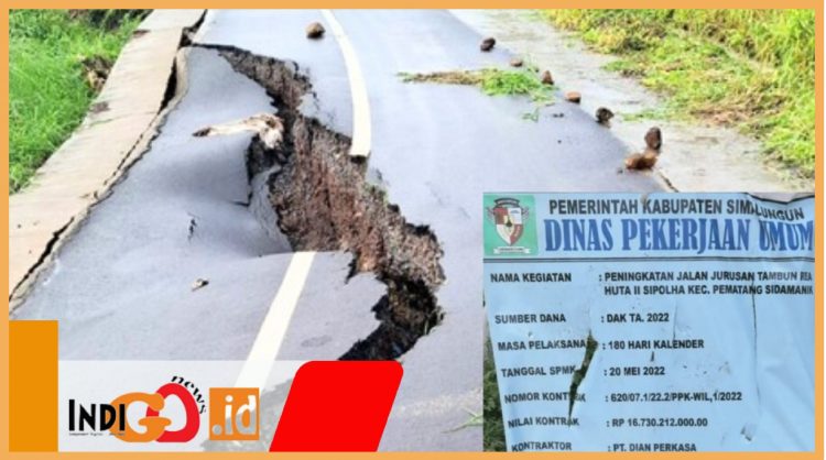 INDIGONEWS – Proyek peningkatan jalan ringroad Tambunrea Huta II Sipolha, Kecamatan Pemanatng Sidamanik, Kabupaten Simalungun – Sumut bersumber dari DAK 2022 dengan pagu anggaran Rp. 16.730.212.000 dikerjakan PT. Dian Perkasa saat ini kondisinya sangat memprihatinkan, diduga saat pengerjaan rekanan dan Dinas PUTR Simalungun berkaloborasi melakukan penyimpangan dengan menimbun tapakan bahu jalan tanpa melakukan pengerasan. Amblasnya bahu jalan dan terjadi keretakan panjang pada jalan penghubung Sipolha dengan Nagori Tambunrea menuju pelabuhan Tigaras persisnya di Dusun IV Nagori Tambunrea.